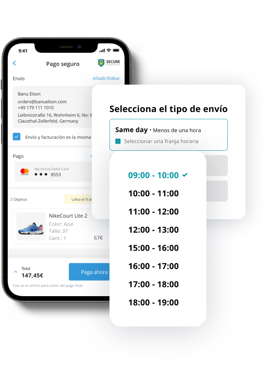Impulsa tus ventas ofreciendo la opción de envíos same day en menos de 1h o en la franja horaria seleccionada y diferénciate de la competencia.